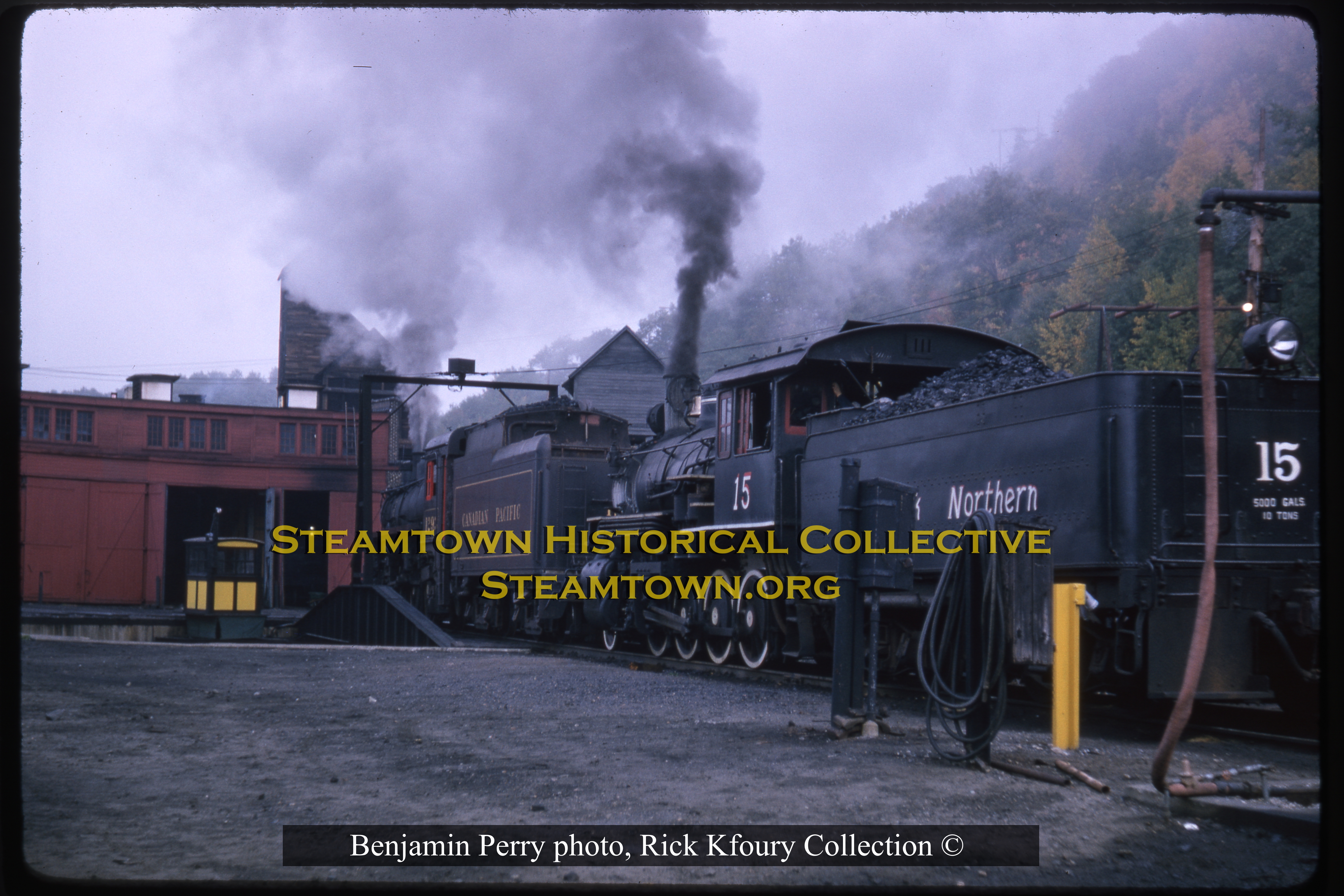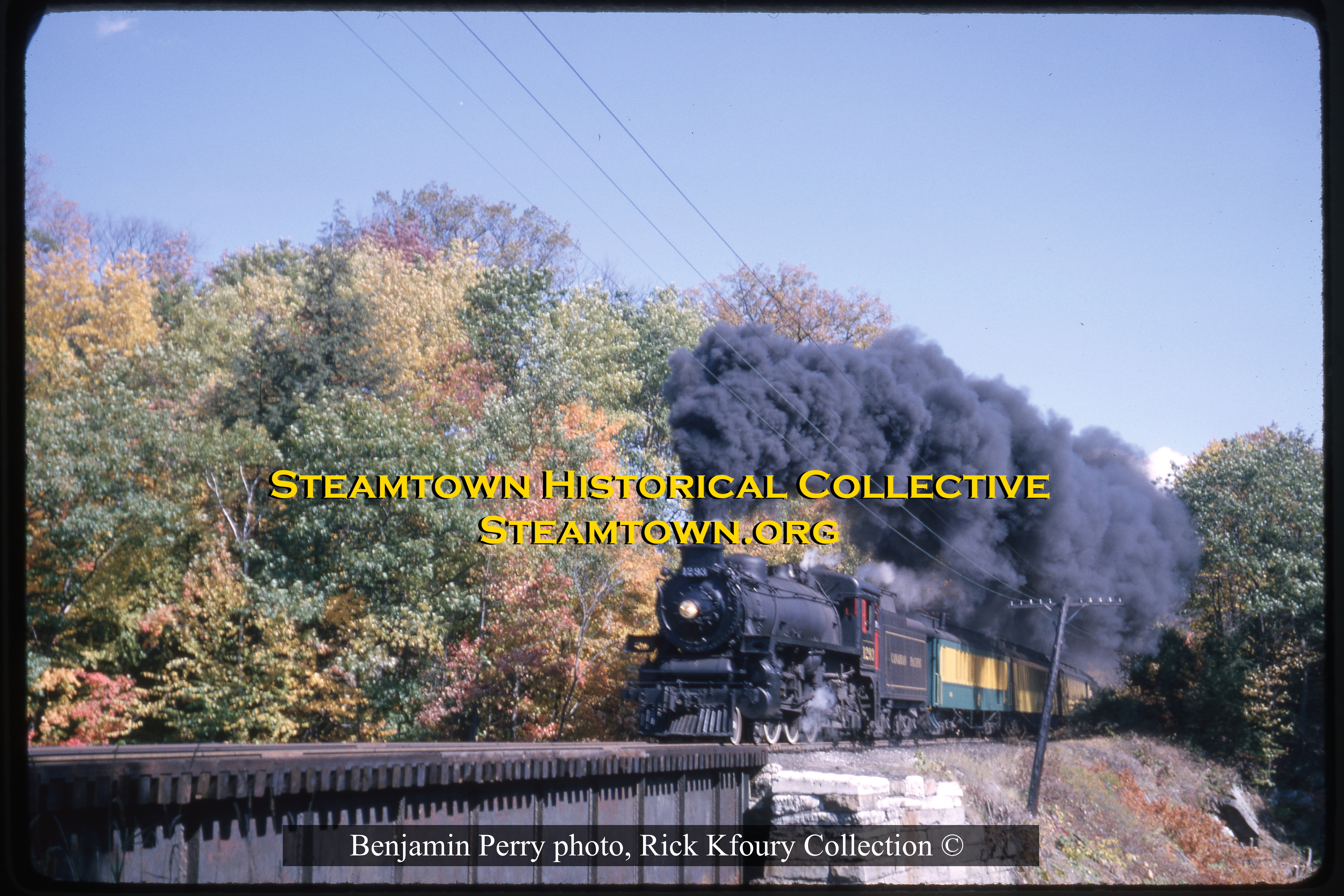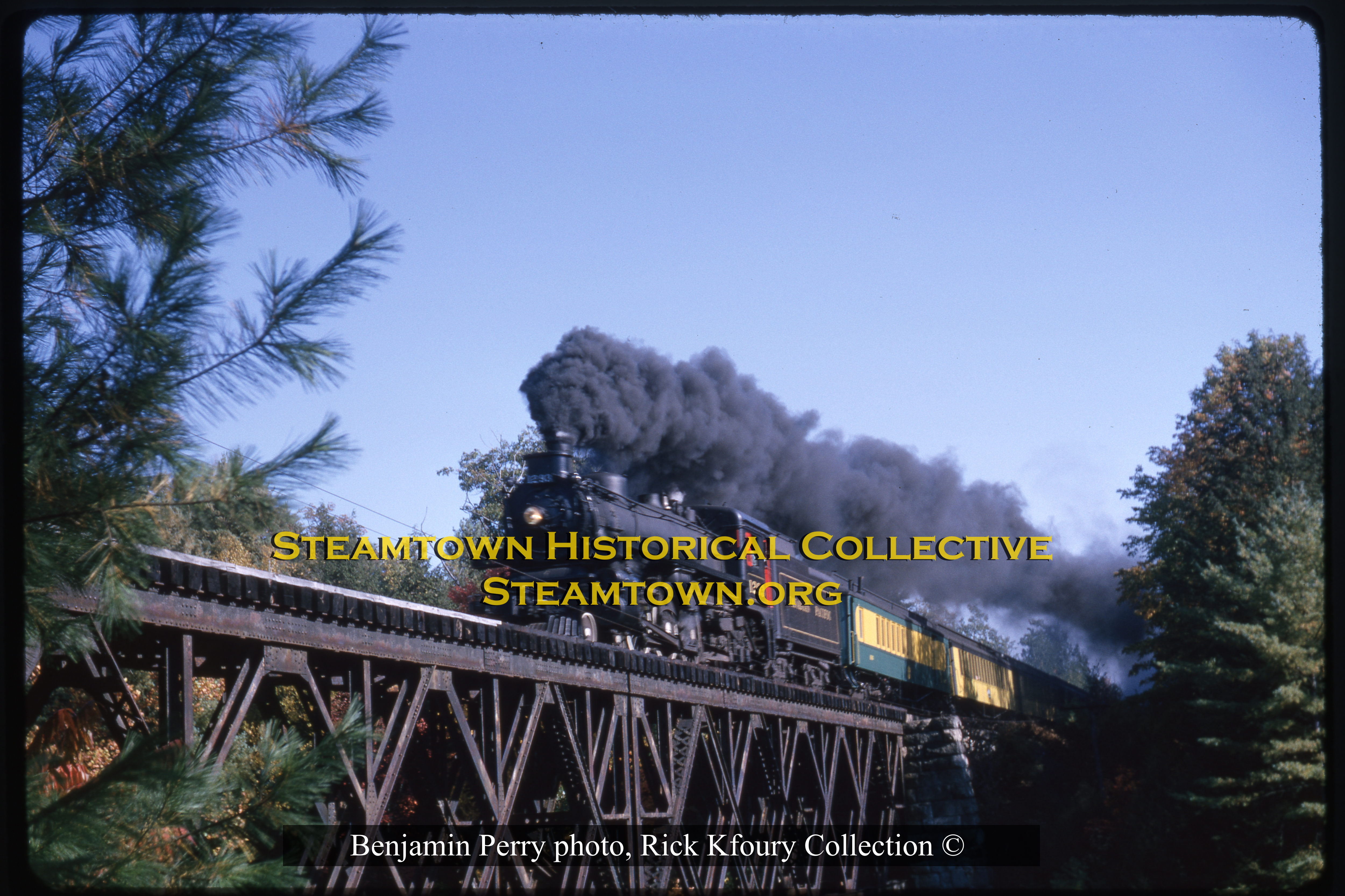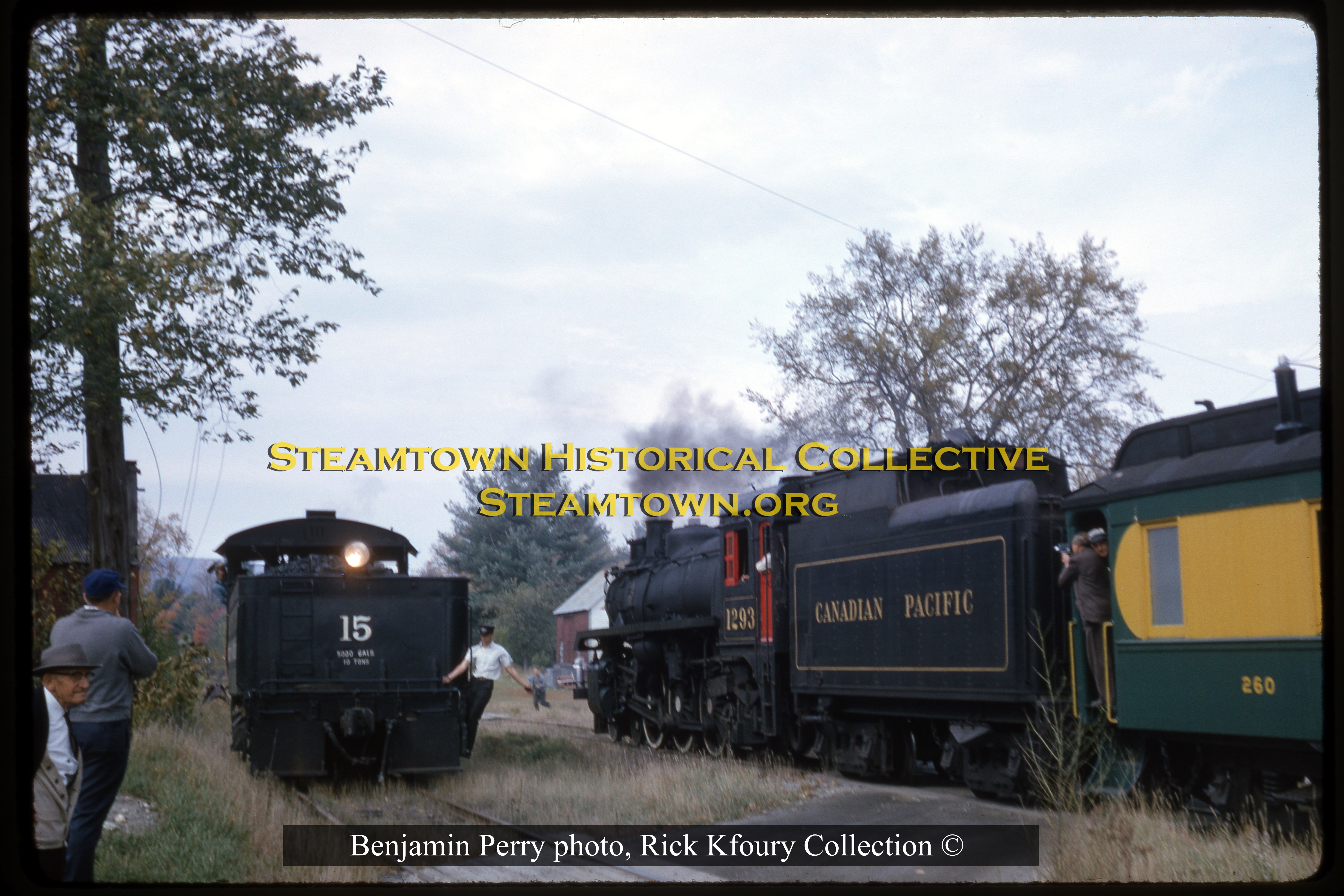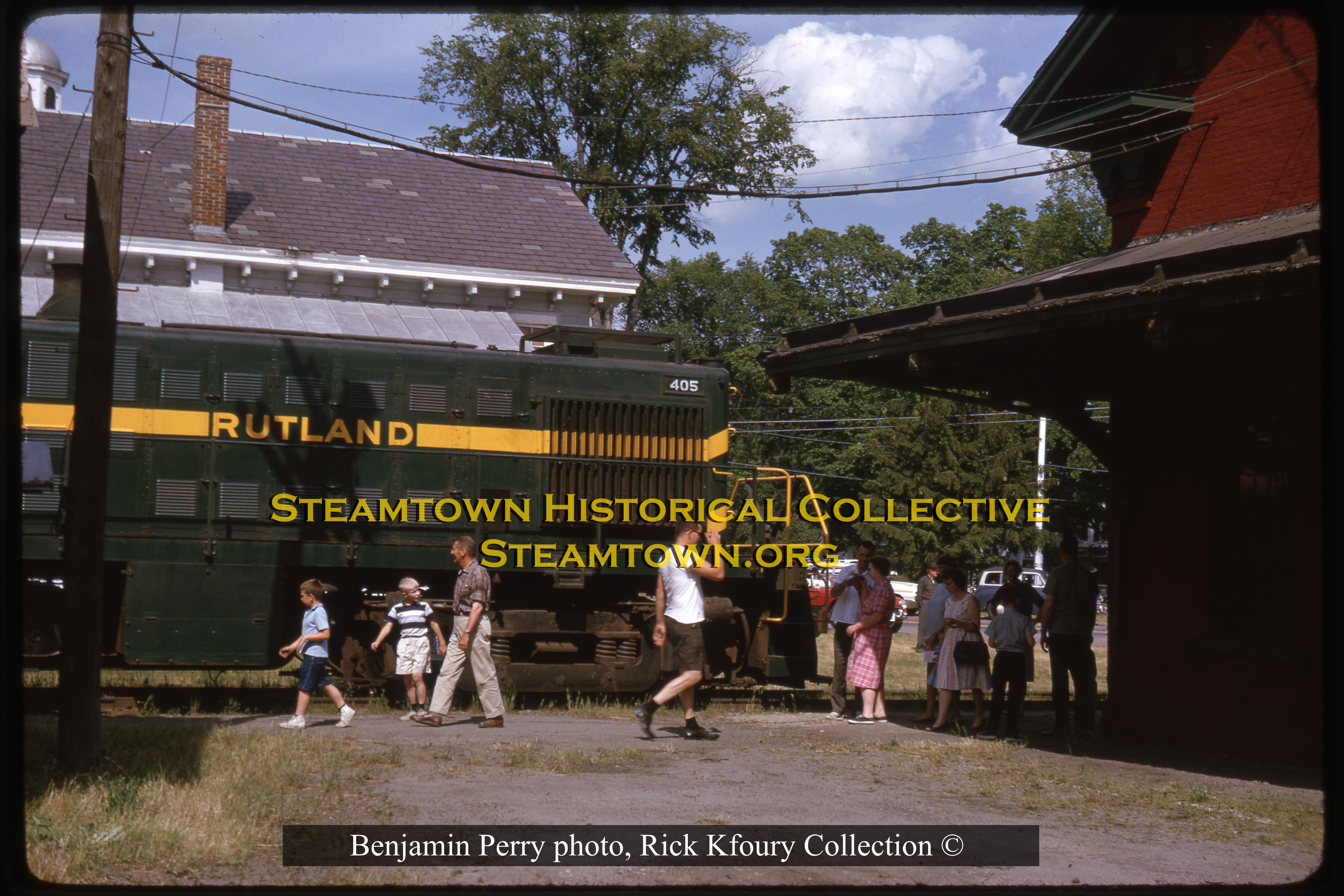 Then, the old Rutland Railroad came to the rescue. With barely more than a board of directors and one locomotive left, a solution was hatched. The Rutland had been allowed to operate freely on B&M tracks in the Bellows Falls area, and so could enter North Walpole unannounced. At 4:00 a.m. on May 24, the Rutland sent its last locomotive, ALCo RS-1 diesel #405, across the Connecticut River into North Walpole. There it retrieved 2-8-0 #15, a number of coaches, and a caboose and dragged them up to Riverside in Vermont to begin the steam excursions the following day. Blount would later purchase the #405 from the Rutland Railroad to become the very first locomotive of the new Green Mountain Railroad.