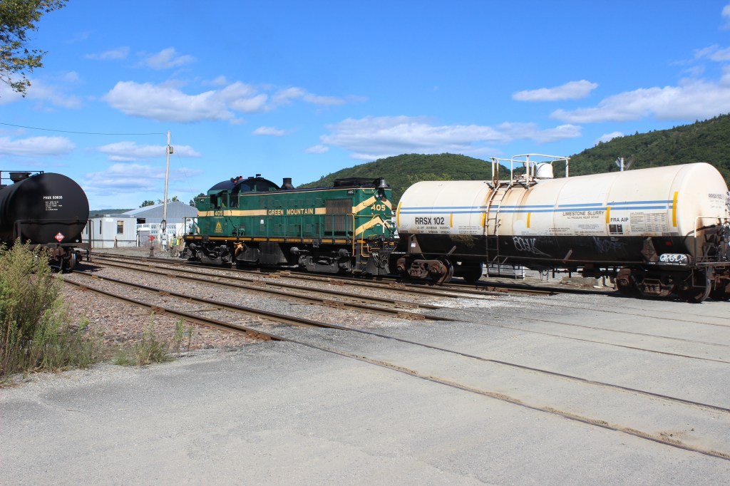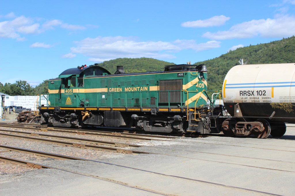 We caught #405 switching the Riverside Reload facility, located at the spot that Steamtown called home between 1964 and 1983. Today the site is an important freight location where lumber, salt, propane, and other commodities are unloaded from railcars into trucks for local and regional distribution. Vermont Rail System, the modern-day owner of the Green Mountain Railroad, has been painting a number of its locomotives this summer; this has resulted in a minor locomotive shortage. It is for this reason that old #405 was called up for switching duty in and around Bellows Falls.